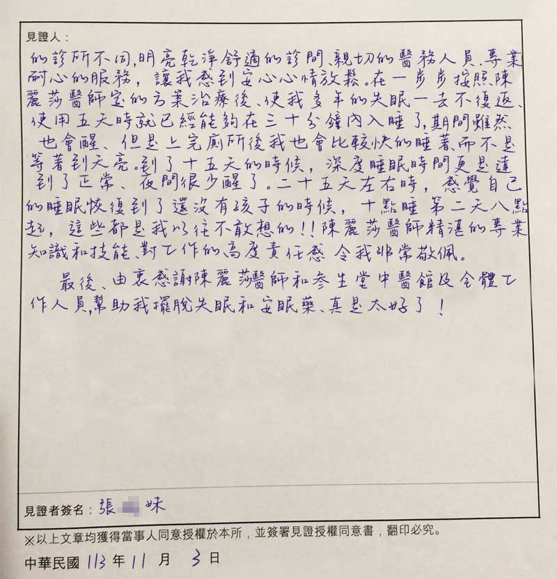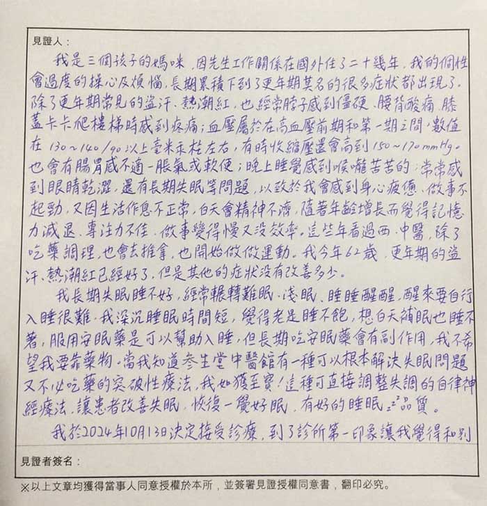 張小姐是三個孩子的媽,個性容易操心及煩惱,加上高血壓、更年期等影響,導致長期失眠睡不好、淺眠,常常睡睡醒醒,難以真正入睡,就算白天補眠也睡不著……;曾試過吃安眠藥助眠,雖有幫助但是副作用不小,所以不想靠藥物。直到她接受了能改善失眠問題的突破性療法,終於恢復一覺好眠,睡眠品質大幅改善,連其他毛病也改善了!